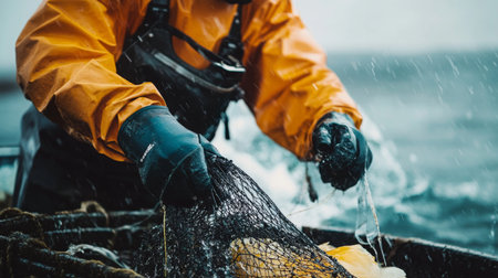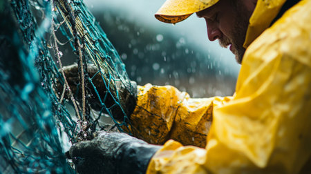 A Mature fisherman mending fishing nets on dock, showcasing weathered hands and focused expression