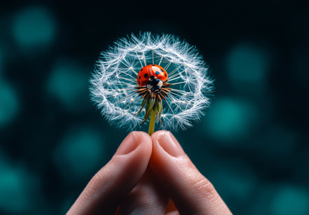 A close up of ladybug perched on dandelion seed head, showcasing intricate details and vibrant colors. image captures serene moment in nature, highlighting beauty of small creatures