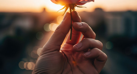A tattooed hand delicately picks an orange flower from a stone surface, surrounded by autumn foliage, capturing the beauty of nature and tranquility.