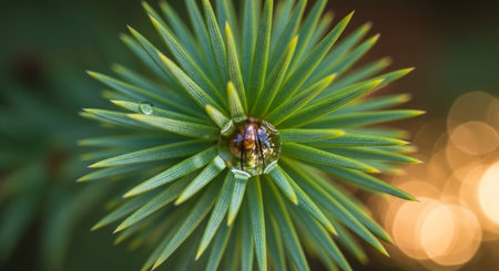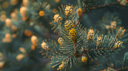 Discover the intricate details of an evergreen branch featuring lush green needles. This image captures the serene essence of nature and tranquility in the forest.
