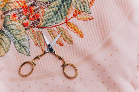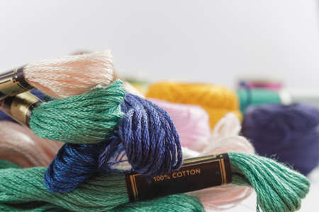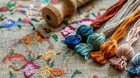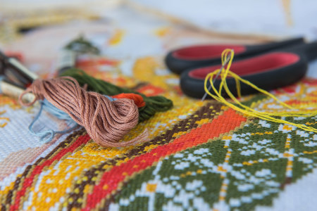 Colorful embroidery threads and patterns, needlework tools on fabric