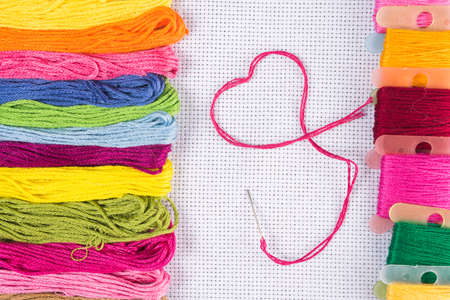 Colored thread for embroidery on white canvas, a needle with red thread in the shape of a heart. The concept of love for a hobby