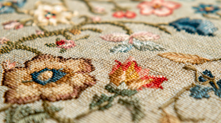 Colorful floral embroidery on canvas with intricate patterns. That the image is generated using AI.