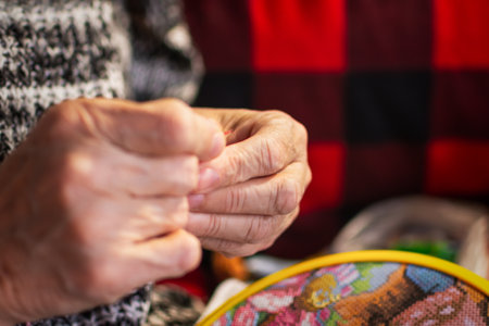 A woman embroiders with a cross. Wrinkled hands close up. An elderly woman holds a hoop and thread with a needle in her hands. Soft focus. The concept of hobby and manual labor. Pleasant home leisure.