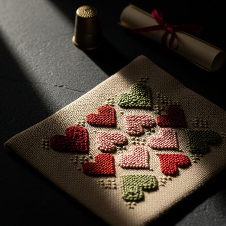 Low key. Warm light. Embroidery close-up. Children's hands.