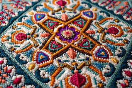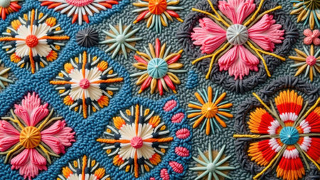 Colorful geometric embroidery pattern with intricate stitching and textile art design. That the image is generated using AI.