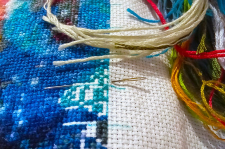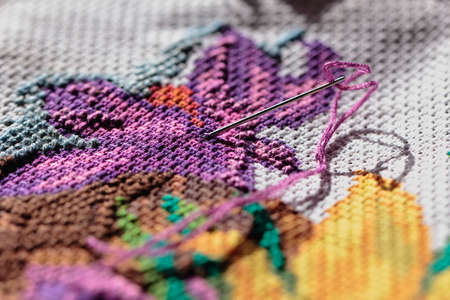 Close-up on a sewing needle with a thread lying on top of a cross-stitched section of a canvas with a pattern. piece of embroidery
