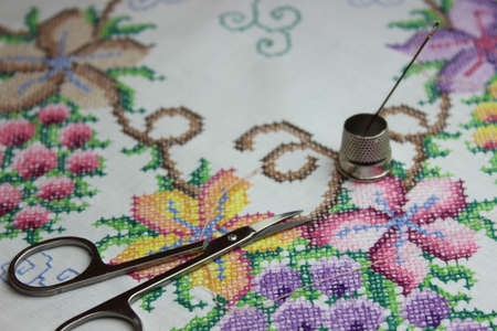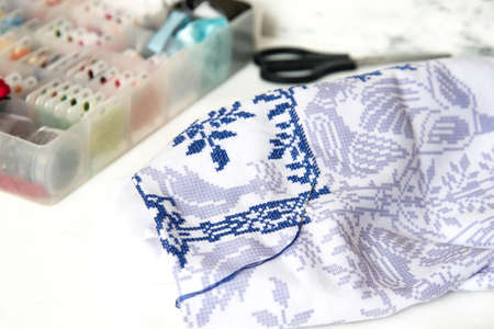 A close up of a cross stitch embroidery. Cross-stitch ornament.