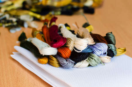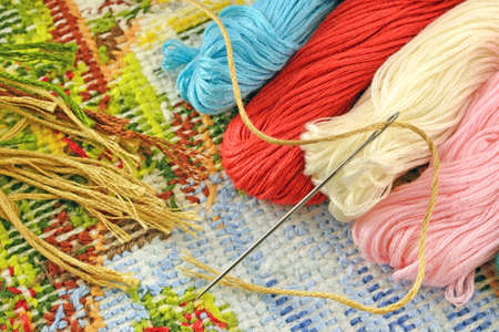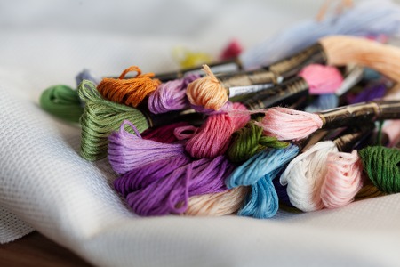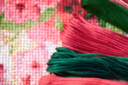 Colorful threads on a fragment of a cross-stitch embroidery.