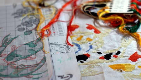 The process of cross-stitch. Canvas on hoops, needles, embroidery floss and pattern. Copy paste