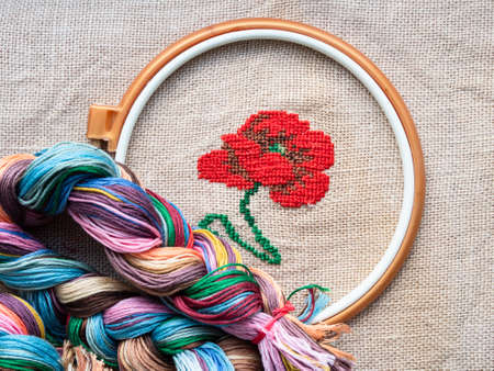 above view of mouline threads in braid, plastic hoop and red poppy flower embroidered by hand on fabric