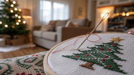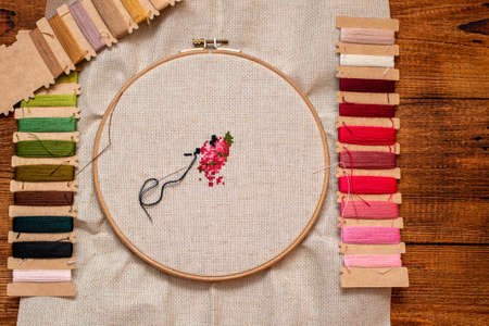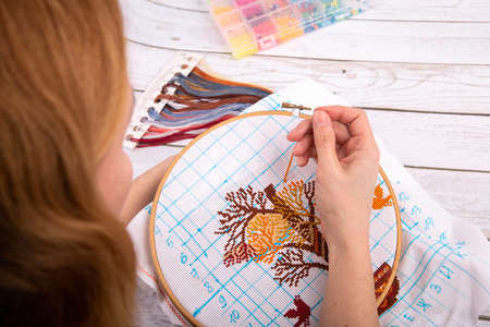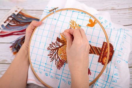 Cross stitching embroidery process. Needle embroidery frame threads. Hobby DIY lifestyle.