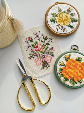 Vintage wooden embroidery hoops, scissors, needle, thread and fabric with floral cross-stitch embroidery on white