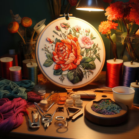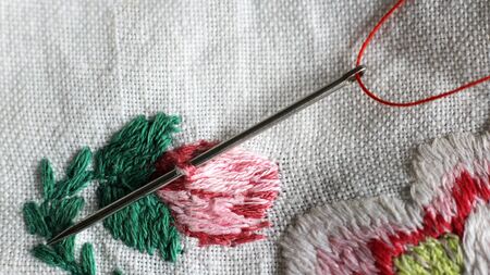 This close-up image captures the intricate process of embroidery, showcasing a needle piercing colorful threads on fabric to create beautiful floral patterns.