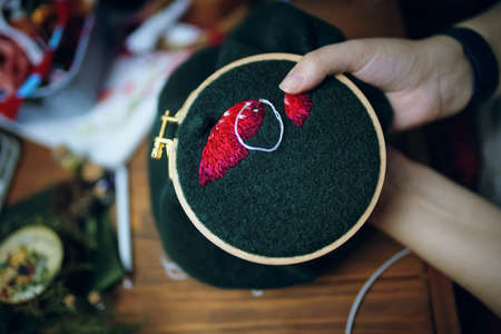 Girls hands embroidery mushroom hat on frame. Concept of hobbies needlework and crafts. Wooden table with different objects on background.