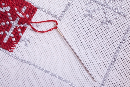 Cross-stitch embroidery and needle with red thread. Red bullfinch on a fir-tree embroidery macro close up. View from above.