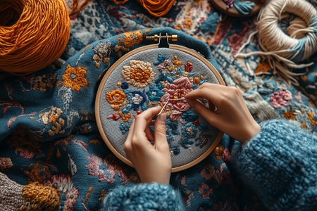 This close-up image captures a hand delicately embroidering floral patterns on fabric. The vibrant threads and intricate designs showcase the beauty of manual artistry.