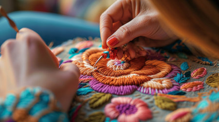 Close up of skilled hands sewing intricate floral embroidery on fabric, showing detailed craftsmanship and vibrant thread colors