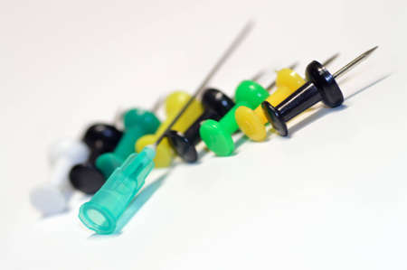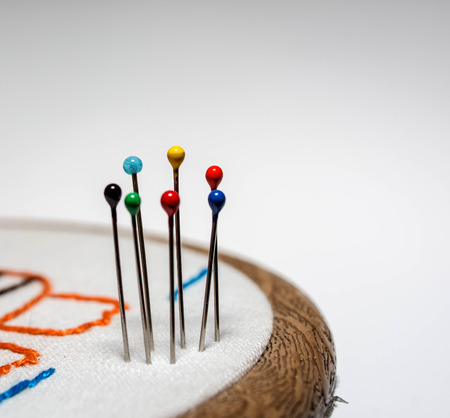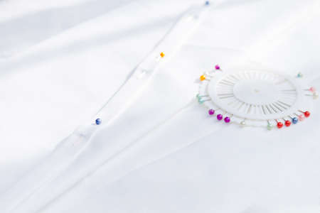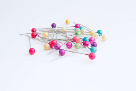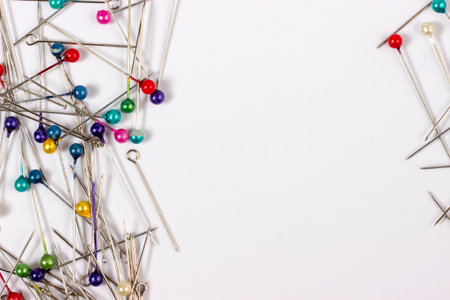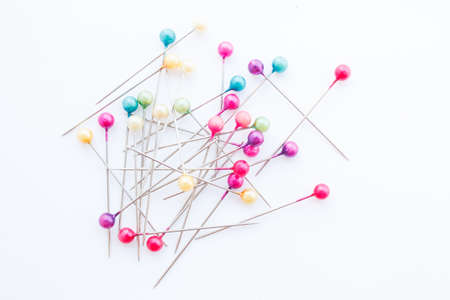 colorful sewing pins are scattered on a white background. A close-up shot with a place for text, an object, a product, or an advertisement on a white background