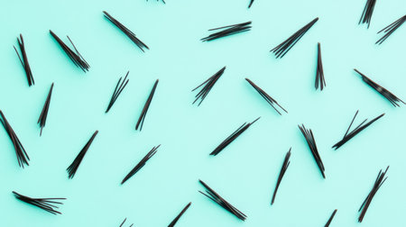 A visually captivating arrangement of black hairpins scattered across a soft turquoise backdrop, perfect for creative projects, design inspiration, or commercial use.