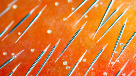 A stunning close-up shot showcasing sharp metal needles against a vibrant orange background, emphasizing intricate details and textures. The visual highlights craftsmanship and precision.