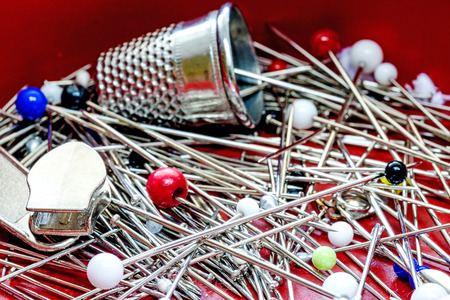 Sewing needles of different sizes in a set of red on a black background. Macro