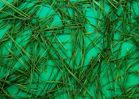 Pine needles with soft shadows on a green background. Christmas or New Year background.
