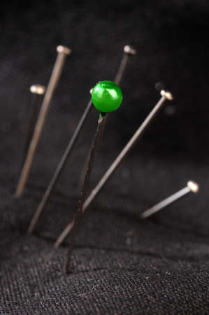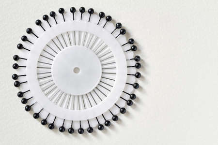 White needle bed with black pins over white background. Set of sewing pins with black heads. Closeup, selective focus, top view