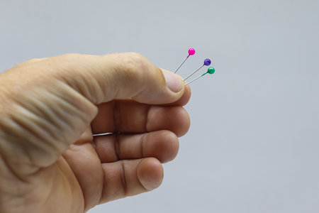 Red, blue, green pins in hand close-up. Pins in the man's hand on a light background.