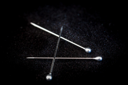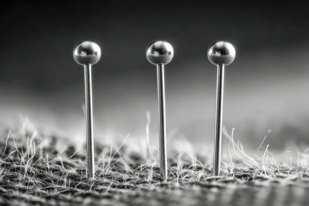 Three shiny metal pins pierce through rough fabric, their smooth profiles contrasting with delicate threads, set against a muted, textured backdrop in crisp detail.