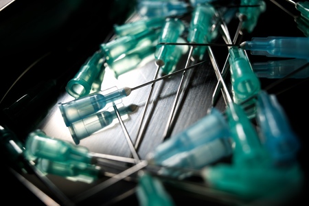 Several syringe on white table prepared for injection in hospital, selective focus, DOF, macro