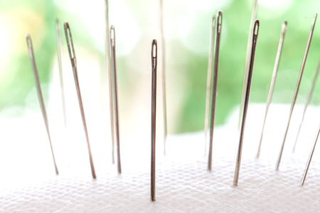 This close-up image highlights a cluster of sewing needles resting on soft fabric, showcasing the artistry involved in textile crafts and creativity.