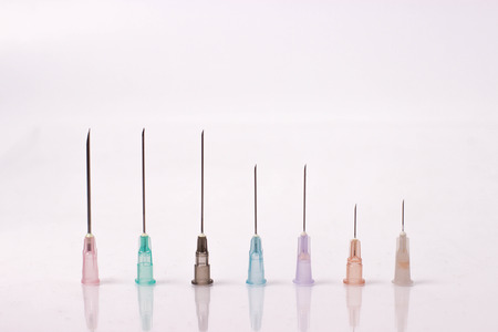 Old rare metallic medical needles isolated on gray background. Needles new and clean. Top view. Sharp needle tips and defocused background.