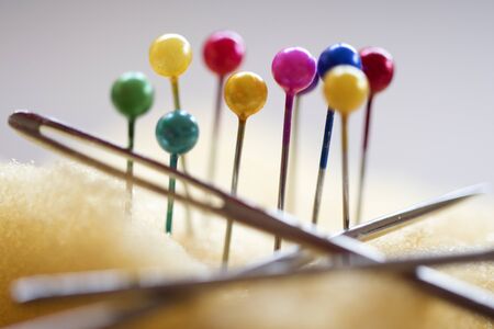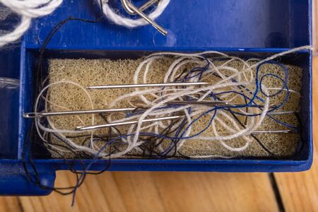 Sewing threads and needles. Accessories for small tailoring works. Light background.