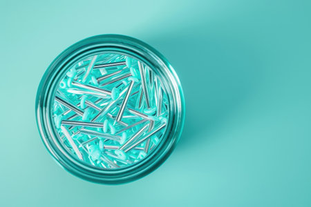 A jar filled with blue and silver screws. The screws are of different sizes and shapes with Generative AI