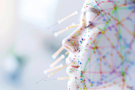 Vibrant pins arranged on skin in gentle sunlight, capturing the delicate art of traditional therapy with a peaceful, calming ambiance.