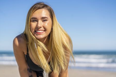A gorgeous bikini model posing in a beach environment wearing headphones, listening to her favorite music
