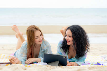 Asian agbtq couple relax and travel togather on the pattaya beach, Thailand
