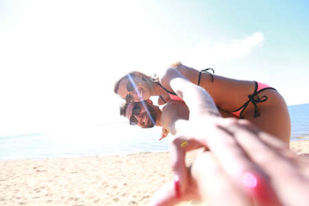 A young couple is having fun and walking on the sea coastline. Legs close up. Romantic date on the beach