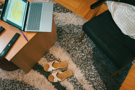 Scene from ordinary life, working at home, empty armchair, laptop on and slippers on a shaggy carpet.