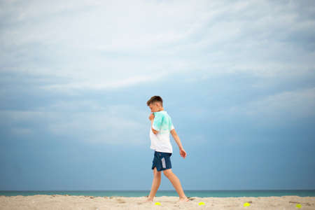 Boy training on a sandy beach. Tennis balls are spread out on the coast. Rest between exercises.