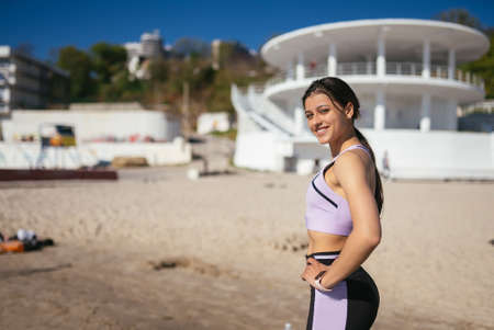 Unknown girl hands reaching to ground exercising on beach close up. Slim sportswoman training yoga near beautiful sea waves. Fit woman feet standing on wet sand seacoast. Relax calmness concept.