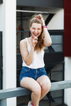 Closeup woman's feet in white sneakers walking up on the stair outside the building, step by step level concept