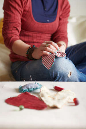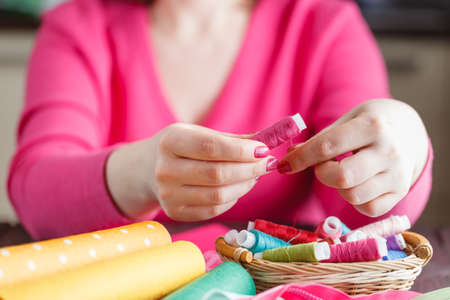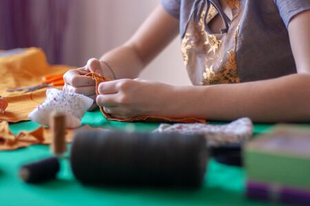 The young seamstress is sewing. Shallow depth of field. Focus on the fingers. Nearby lies a needle pad and spools of thread. Horizontal.