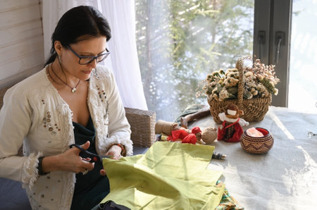 Woman is sewing a blue fabric in a cozy living room, surrounded by natural light, showing her skills and dedication to sustainable fashion and creativity