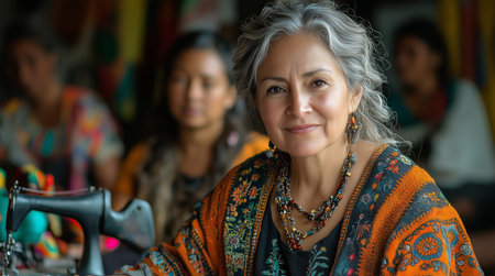 a woman teaching a group of women in a sewing workshop, showing patterns and fabrics, with colorful textiles and sewing machines in the background, illuminated by natural light