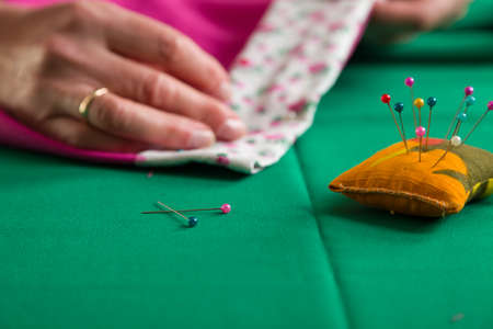 Sewing workshop. Preparing the sewing blanket. Knocking material. The dressmaker attaches pins to the stitching material.