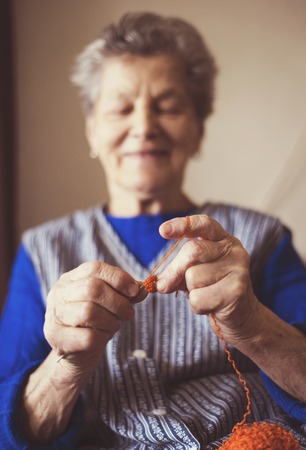 Portrait of senior woman sitting in armchair and knitting at home