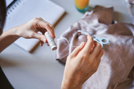 Close up women's hands of seamstress at work with tissue fabric