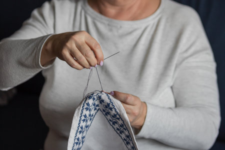 Close up of senior woman hands doing embroidery on a cloth. Interior